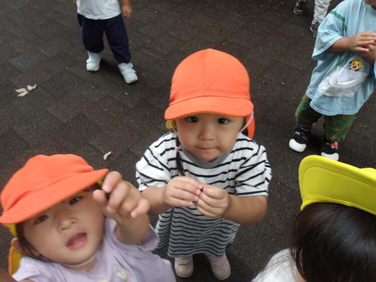 こちらでは、どんぐりの帽子を見つけた子が見せに来てくれました。