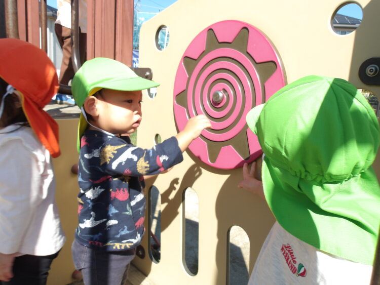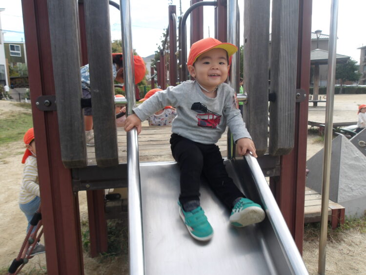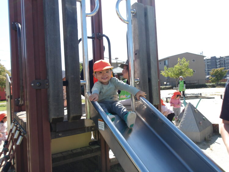 ひよこ組のお友だちも、保育者に手伝ってもらって滑り台に。満足そうに笑ってくれました☺️
