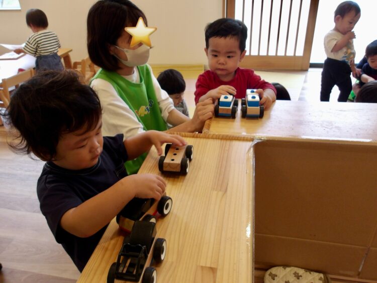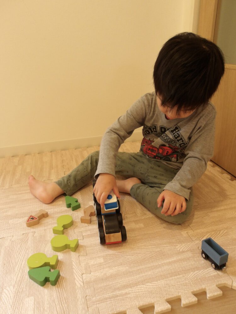 車のおもちゃでは、パーツを組み合わせてお部屋の色々な場所を走らせて遊んでいました。