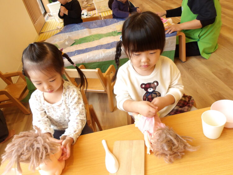こちらでは、お着替えをしたりご飯をあげたりと小さなお母さんになりきっていました🤭