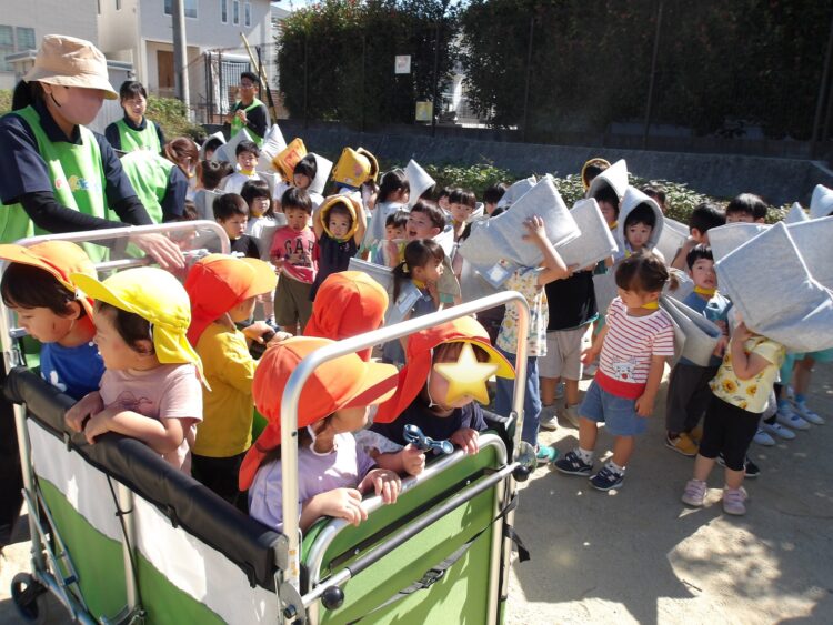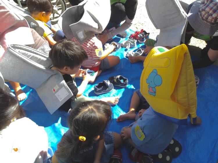 うさぎ組は靴を履いて歩いて第一避難所まで避難します。最近靴の練習をしているうさぎ組の子どもたちは、先生に手伝ってもらいつつもスムーズに履くことができました✨