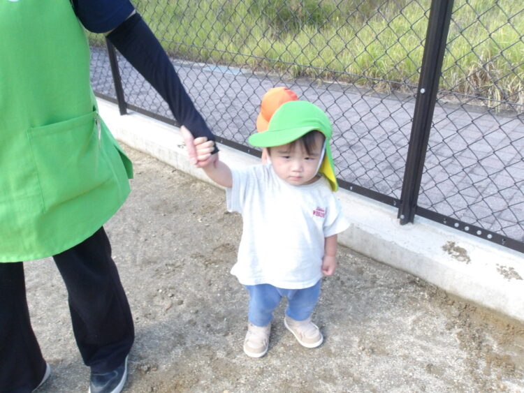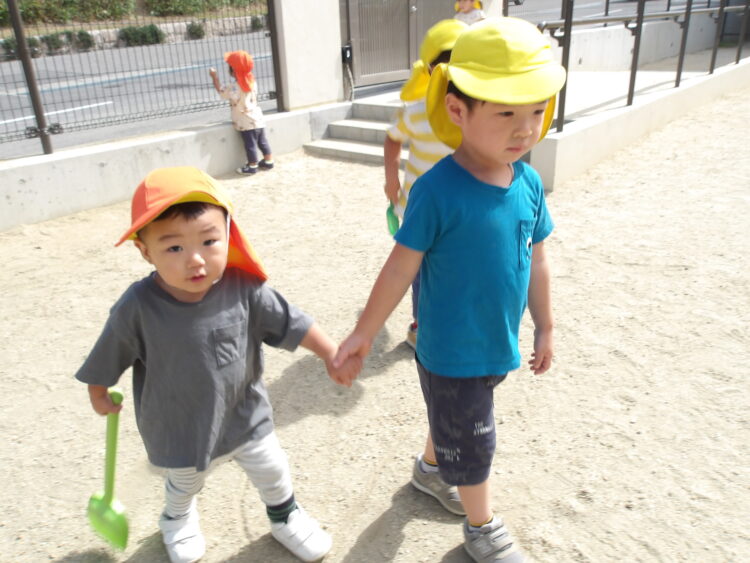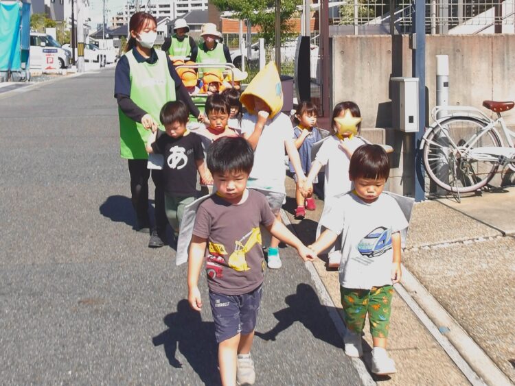 手を繋いでしっかり歩きます。列からはみ出さずに歩くことができていますね。