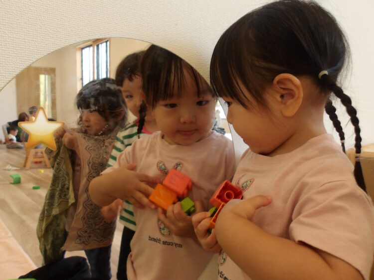 鏡の中の自分を見てニコッとしたり、手を振ってみたりと楽しんでいましたよ。