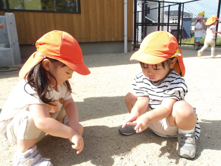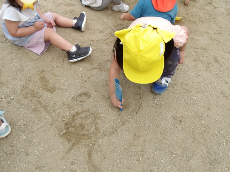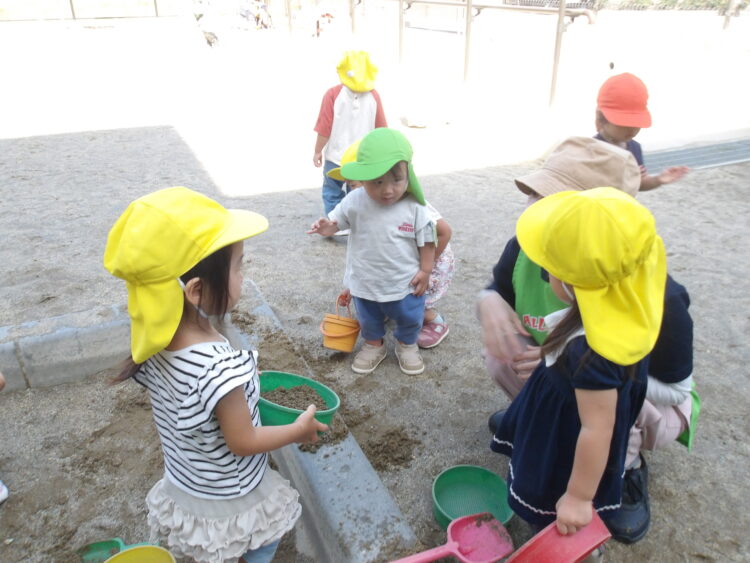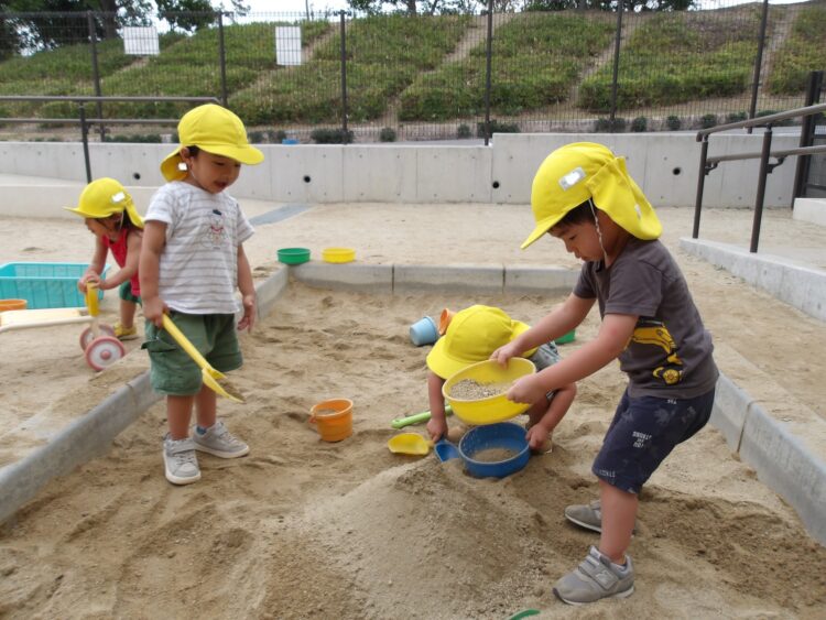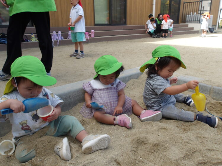 砂場を見てみると、ひよこ組のお友だちが並んで遊んで微笑ましかったです🥰
