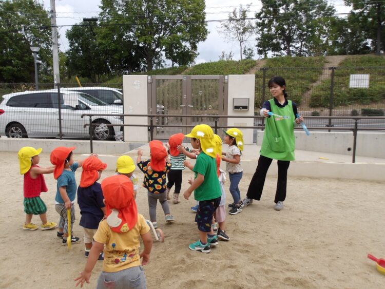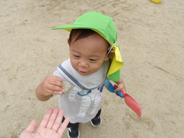 園庭でもお友だちや保育者とのやりとりを楽しんでいました。