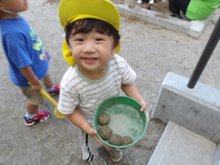 砂場で作ったケーキやごはんを乗せて、配達する姿も見られましたよ。