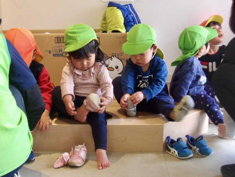 あひる、ひよこぐみの子どもたちは自然と、靴や帽子の準備を自分でやろうとする姿があります。