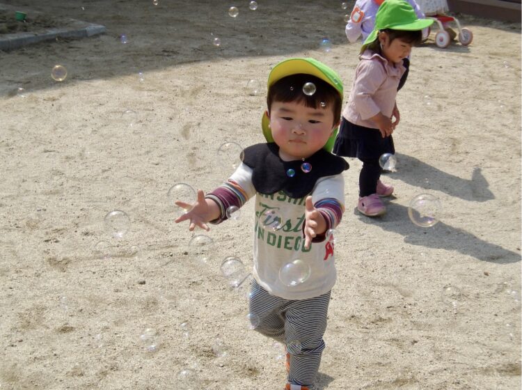 お外では子どもたちのリクエストもあり、今日もシャボン玉を楽しむ姿がありました。