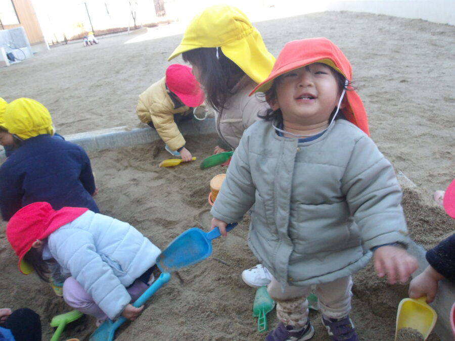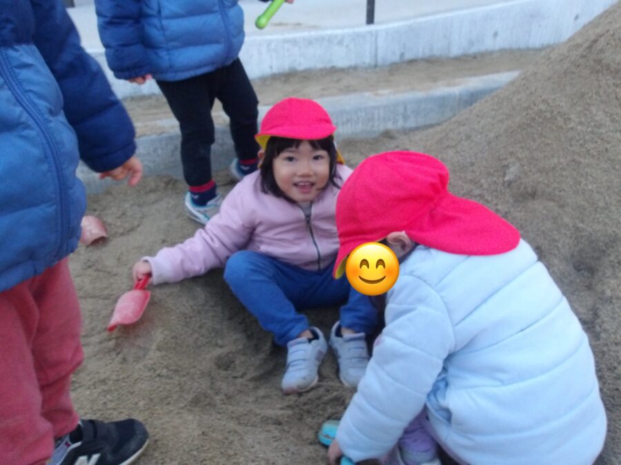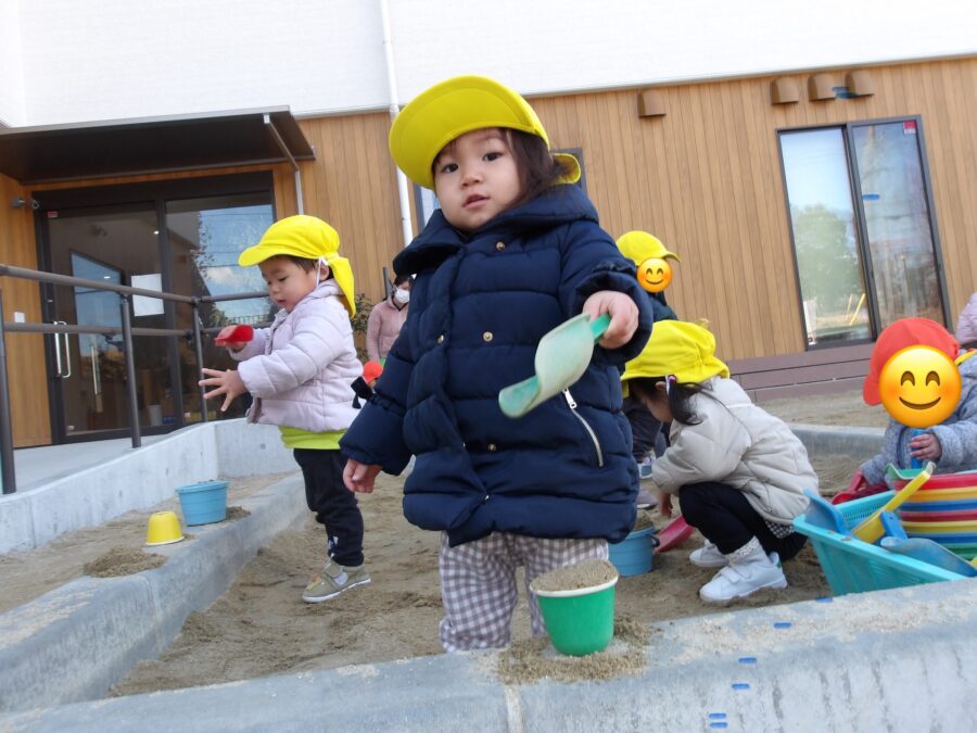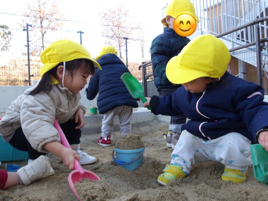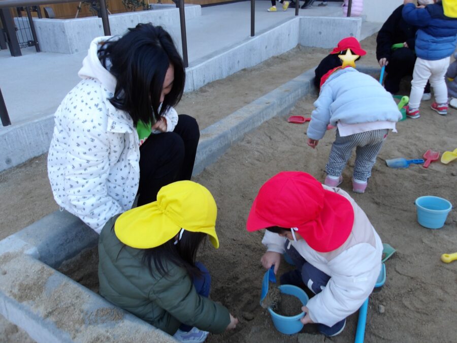 お砂場では、お山を作ったりお友だちと協力してバケツいっぱい砂を入れたりして、遊ぶ姿が見られましたよ😊