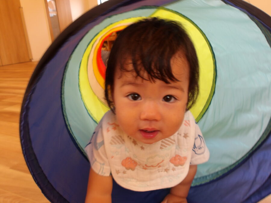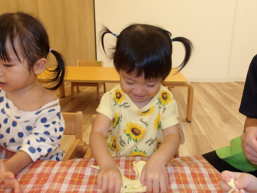 今日は、小麦粉粘土で遊んだり、トンネルをくぐって思い思いに遊びました。小麦粉粘土では、丸めて伸ばして集中していました。感触が気持ちいいようでした。