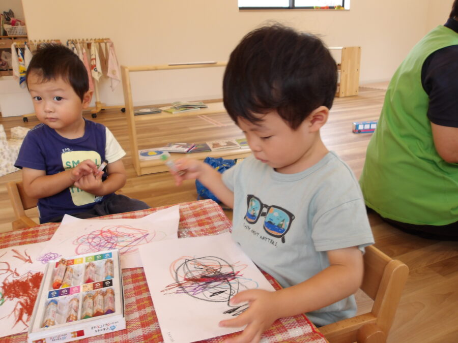 今日は、お絵描きをしたり、トンネルやマットのお山、ボールプールで思い思いに遊びました☺️