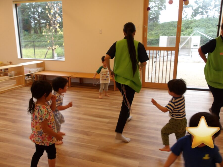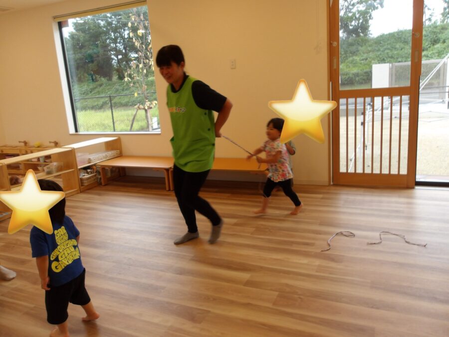 しっぽとりでは、先生のしっぽを追いかけて楽しんでいました。