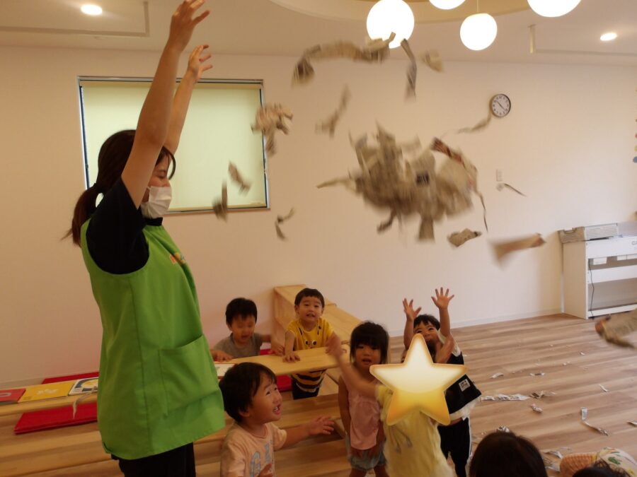 また、新聞紙遊びでは、新聞紙シャワーを浴びて嬉しそうにしていました。