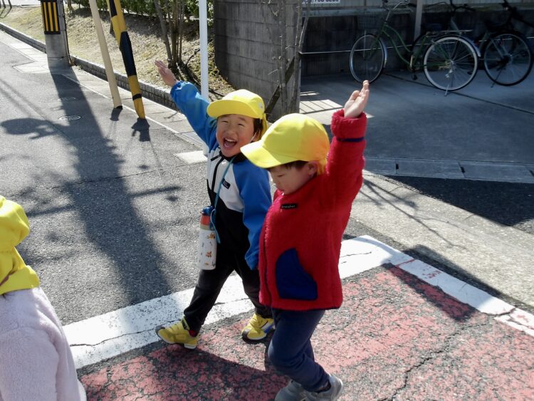 並んでの準備体操に慣れて来たようです!大きな声で「ご!ろく!なな!はち!」と数えていました。