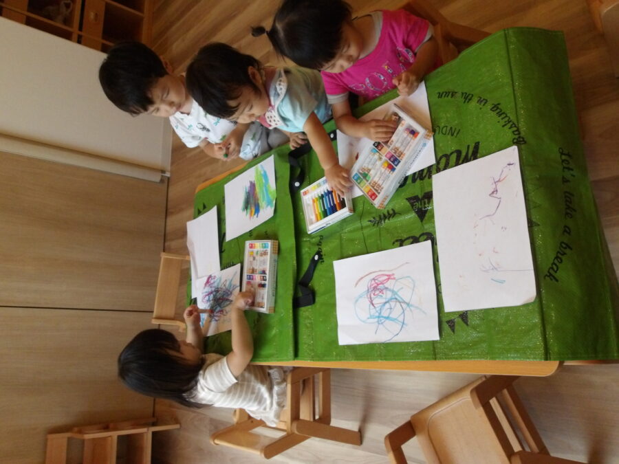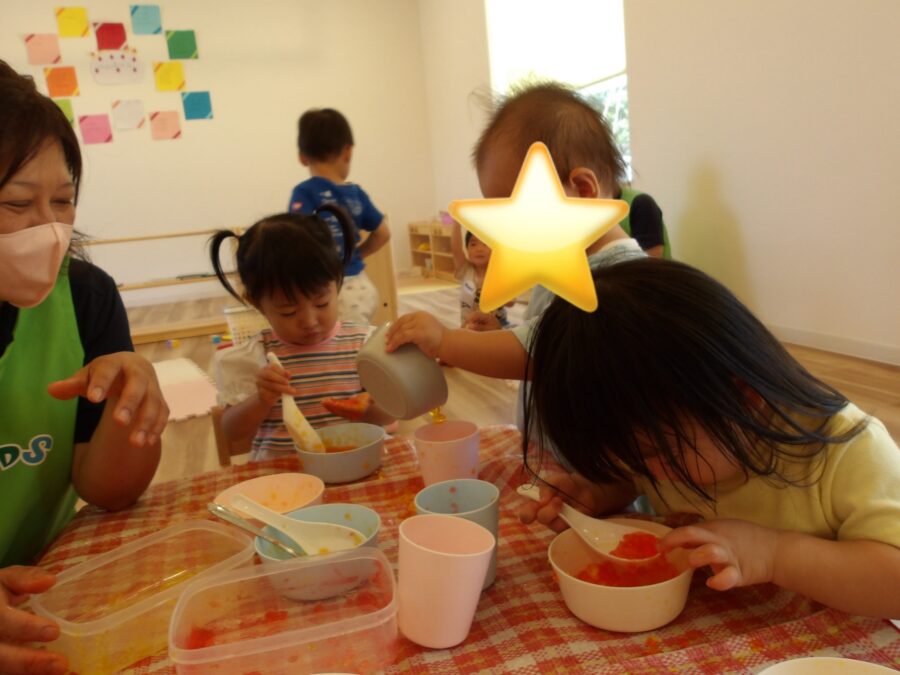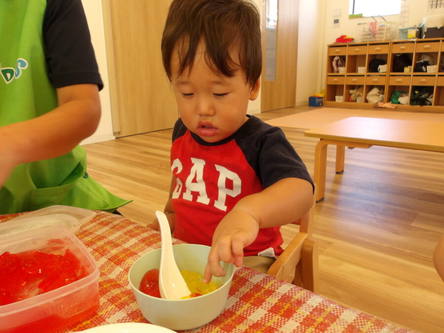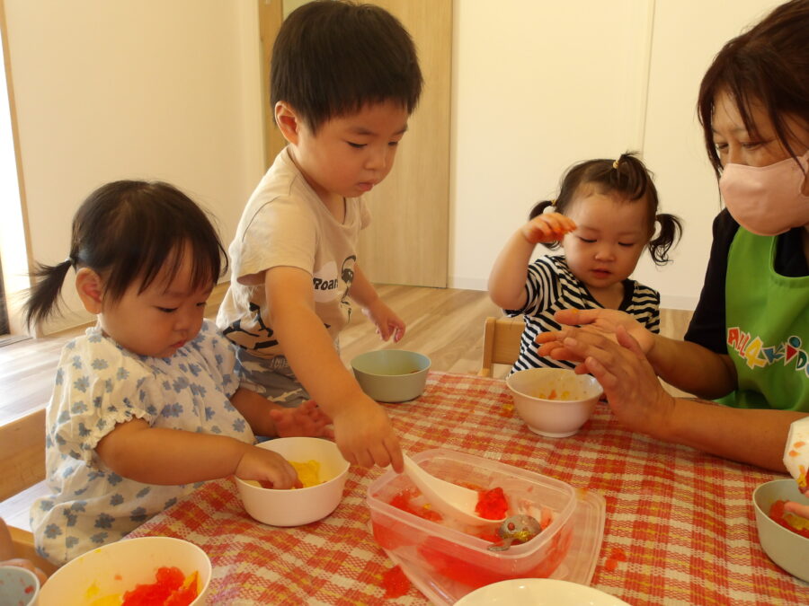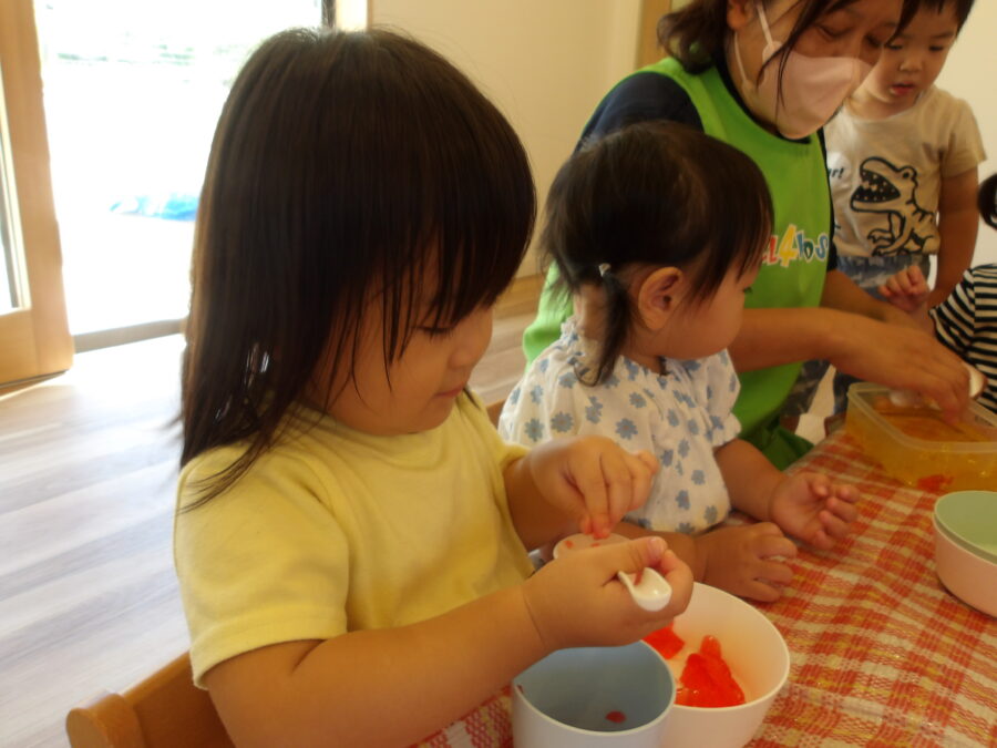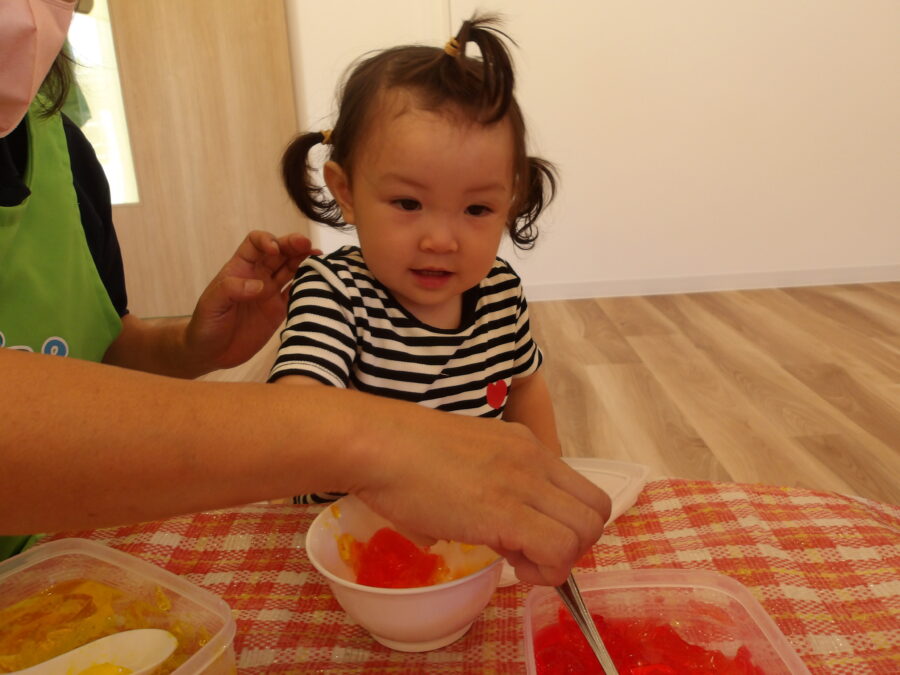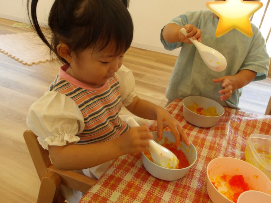 混ぜると細かくなり、キラキラと輝いている様子を見て「キラキラー!」と嬉しそうに教えてくれる子もいました![]()