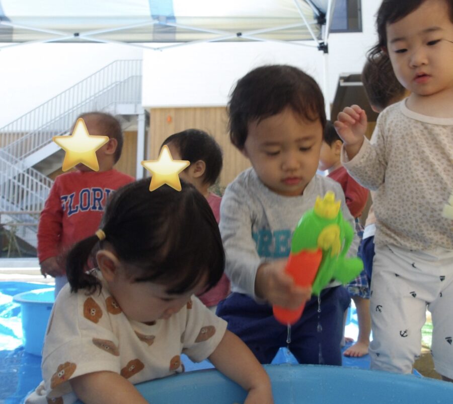 お友だちとお水をかけ合ったり水をまいている保育士の側に来て「あめ!」と楽しむ姿が見られましたよ☺️