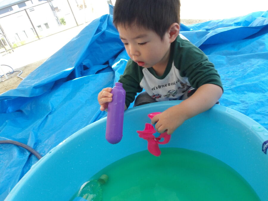 水鉄砲に水を入れている先生の姿を見て真似っこする子も!