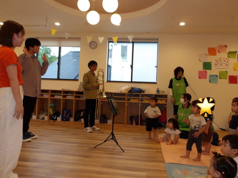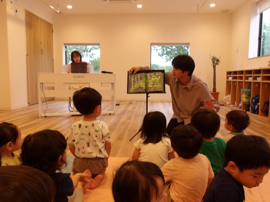 絵本の内容に沿って、ピアノやトロンボーンの演奏、お兄さんの上手な歌が聞けて子どもたちは、体を揺らしてリズムを取ったり、パチパチと拍手をしたりと夢中になって楽しんでいましたよ![]()