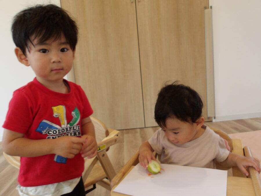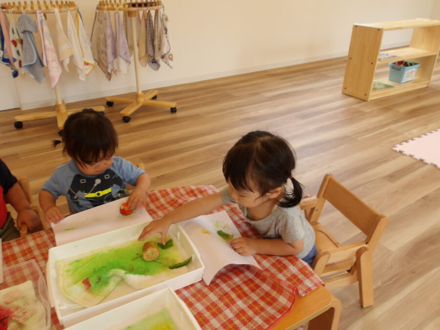 畑にできた野菜でスタンプ遊びをしました。