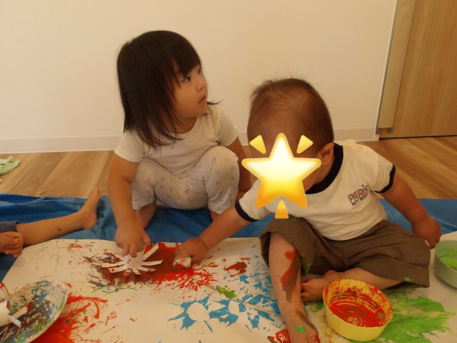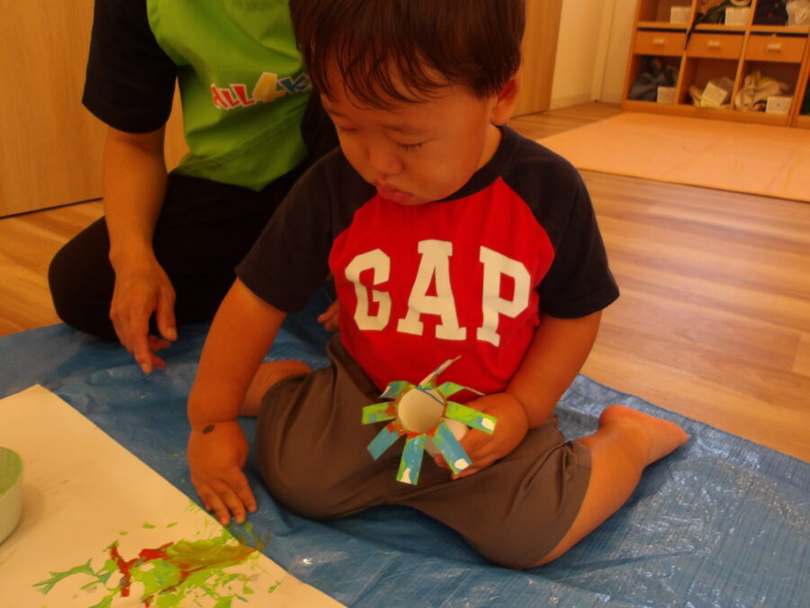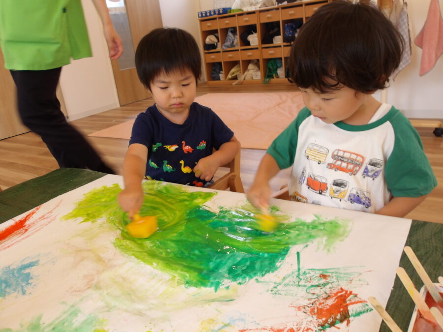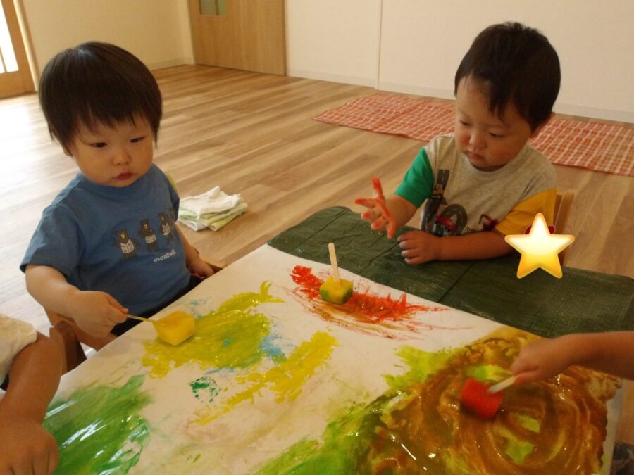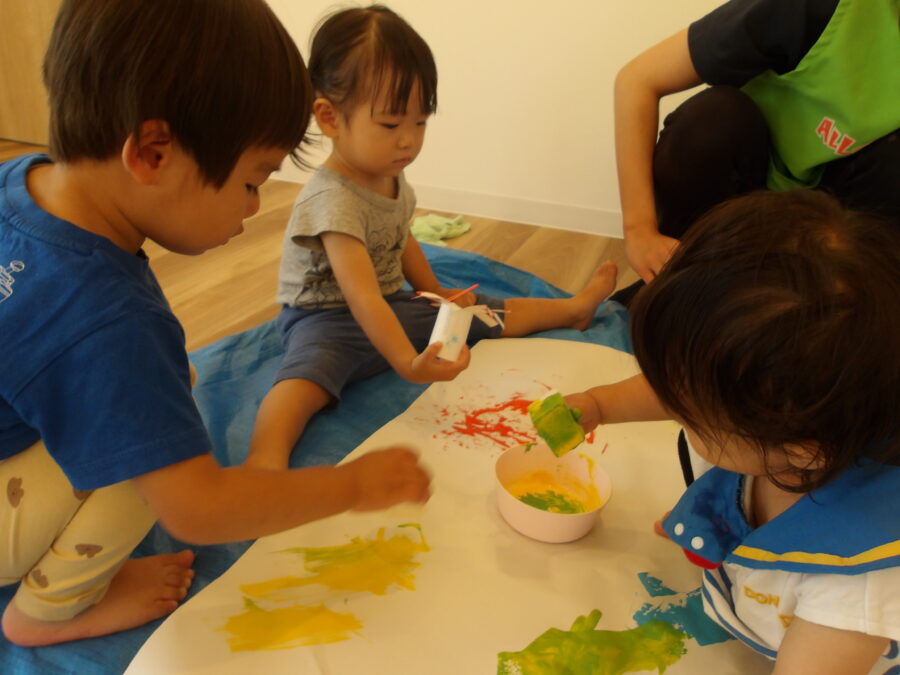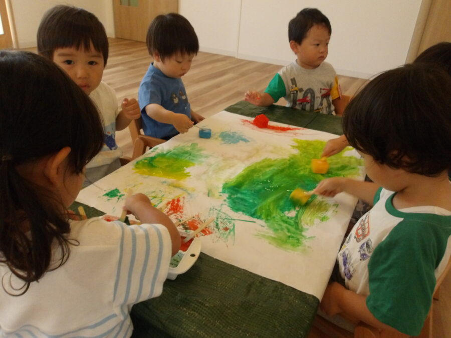 トイレットペーパーの芯で作ったスタンプやスポンジのスタンプで模様をつけてみたり、手や足でダイナミックに描いてみたりとみんな夢中になって楽しんでいました