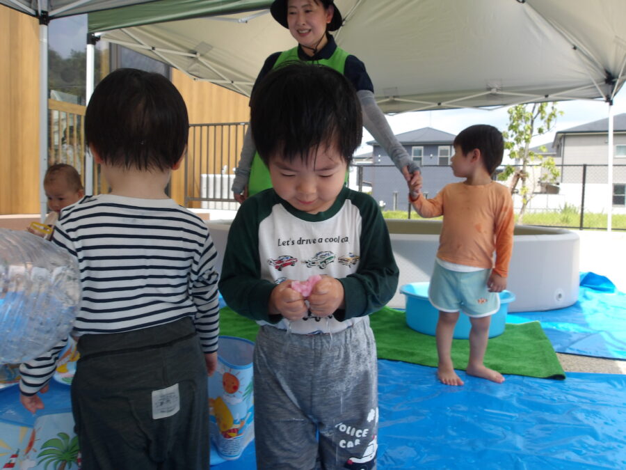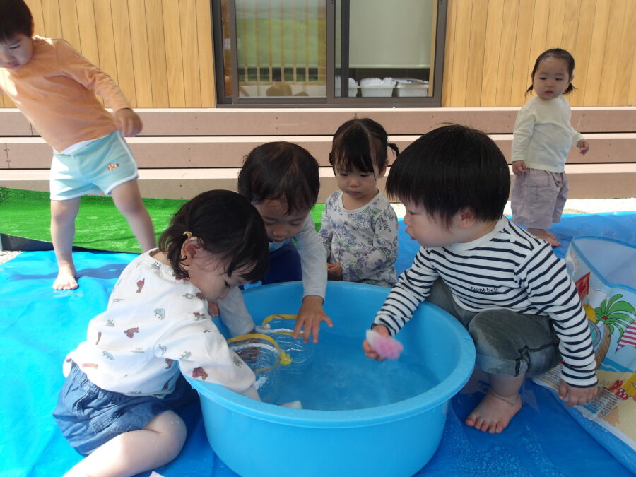 ペットボトルに水を入れて楽しむ子や、スポンジを絞ると水が出てくる事を楽しむ子もいました😊