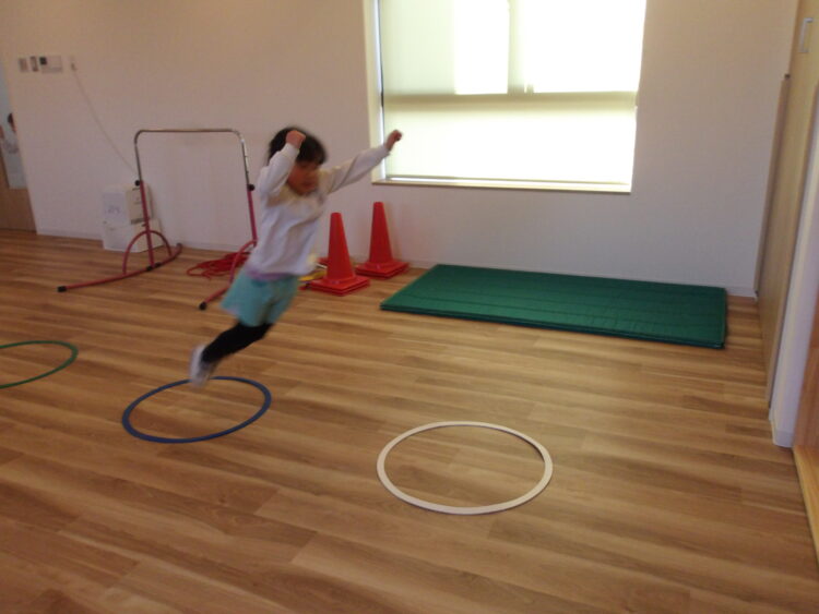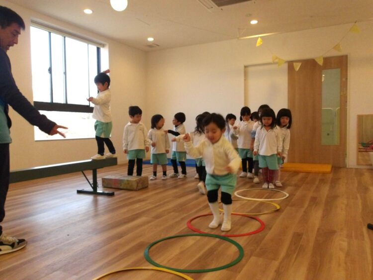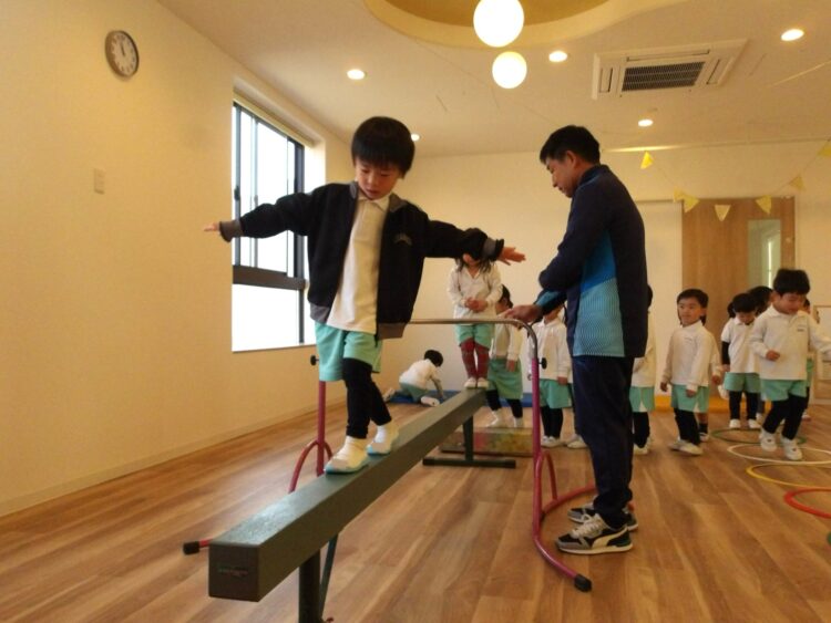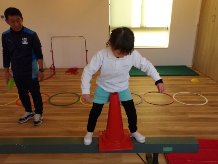 後半に行くにつれてバランスが崩れて転んでしまうことがあり、「あとちょっとだったのにー!」「もう一回やる!」と悔しさをバネに何度も取り組む姿が見られました。