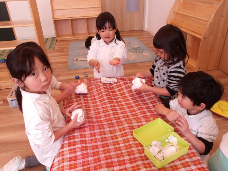 周りで見ていた子も楽しそうな雰囲気に釣られて自分の粘土を持ってきて一緒にパン作りを楽しんでいました♩
