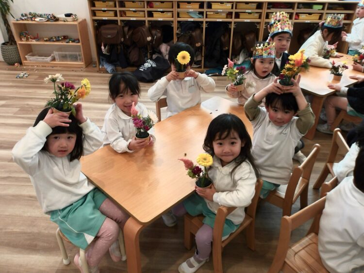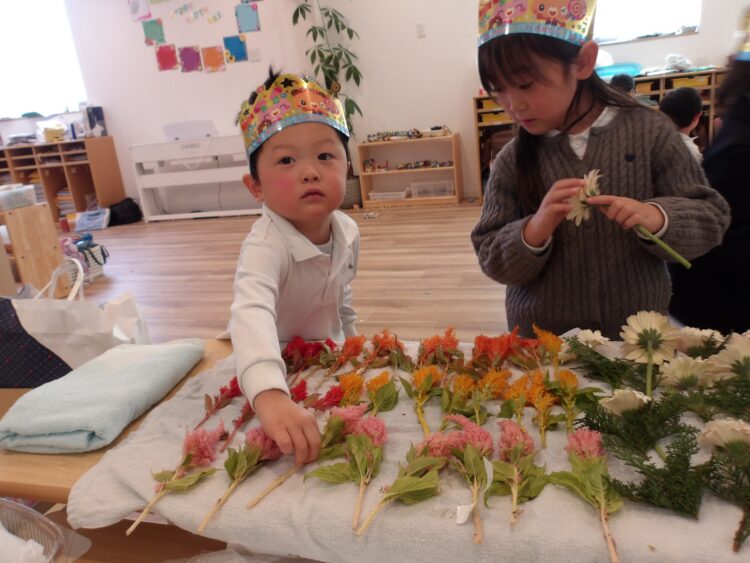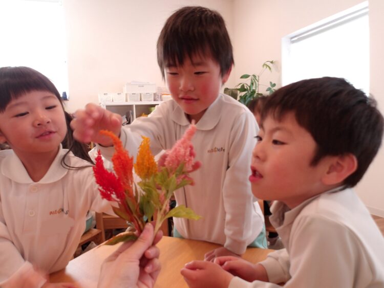 色鮮やかな《ヤリゲイトウ》はフラワーアートに初めて登場した植物で、色が違うと匂いも違うのかな?と一本ずつ匂いを嗅いでみる子どもたちでした。
