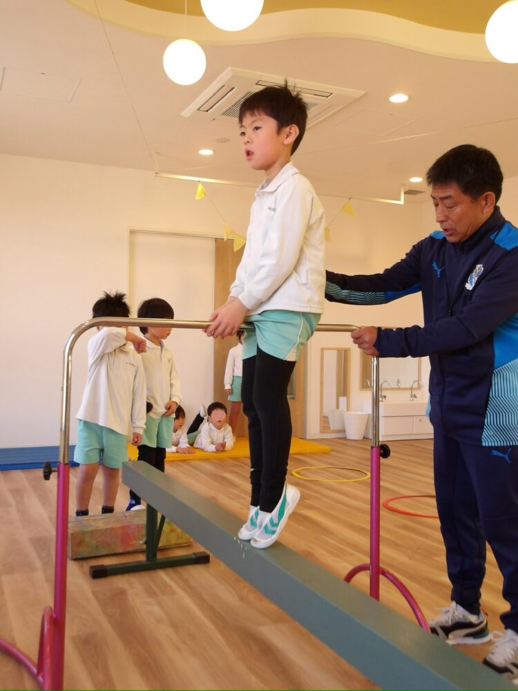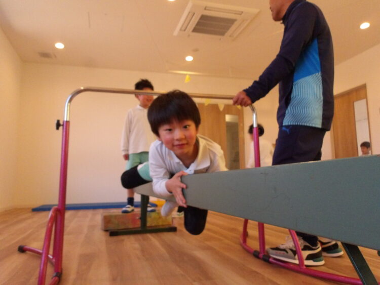 鉄棒に触れないように下を潜って渡るなど、講師の指示があるたびに、「え〜どうやってやろう」「こうやったらいけそう!」と考えてからやってみようとしたり、実際にやりながら工夫して渡ろうとする姿が見られました。