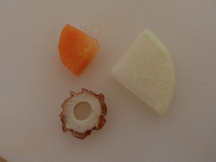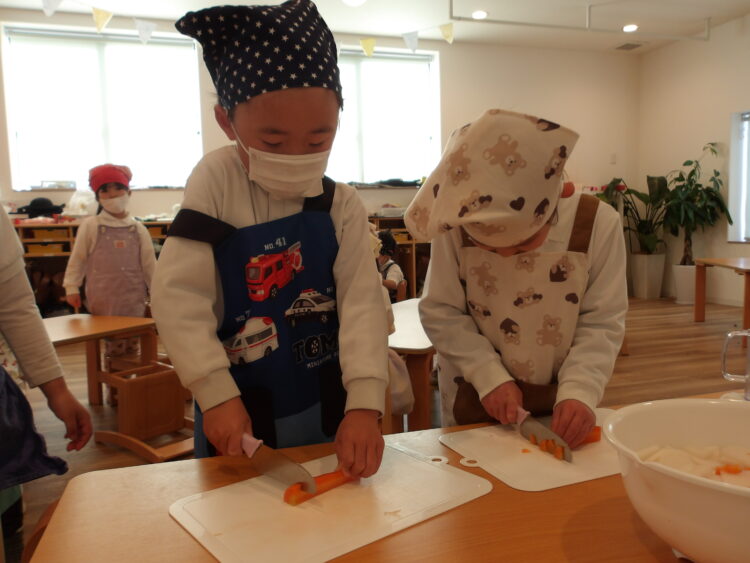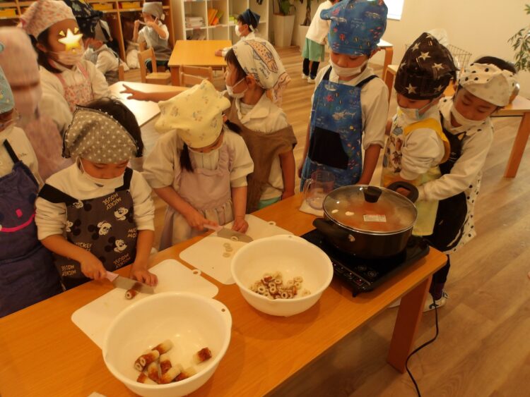 にんじん・大根はいちょう切り、ちくわは輪切りにするよ、と伝えると、最初は「いちょうぎりってなに?わぎり??」と聞きなれない言葉に不思議そうな子どもたちでしたが、いちょうの葉の形と実際に切ったにんじんの形がリンクすると、納得した様子でした。