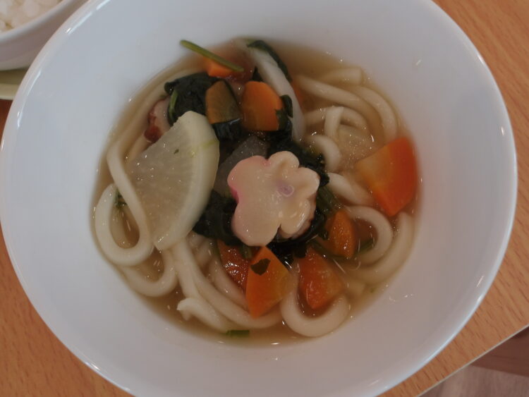 かまぼこの代わりに花麩、おもちの代わりにうどんを入れたお雑煮風うどんの完成🌟