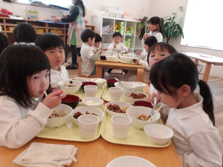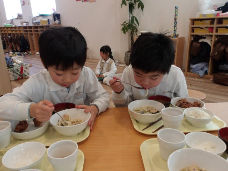 隣のお部屋であそんでいたそら組のお友だちも「今日おうどん作ったの?!」「うどん好きー!」とちゅるちゅるっとおうどんを啜り、体を温めながら美味しく食べました♩