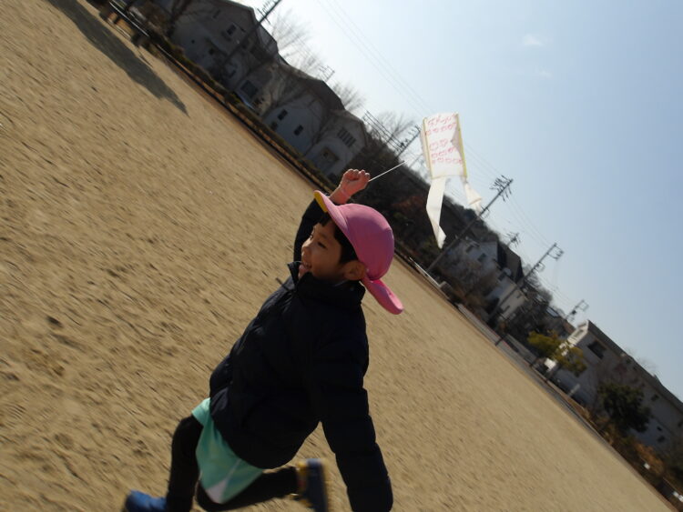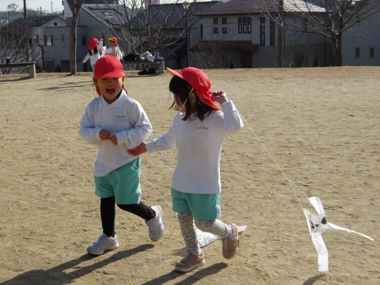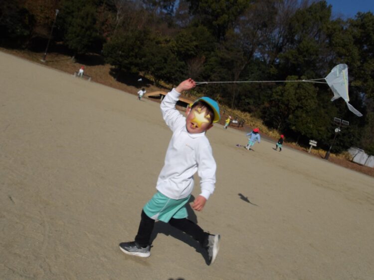 あそんでいるうちに風が吹くと立ったままでも凧が揚がることに気付き、「走ってないのに勝手にとんだ!」と驚く姿も見られました。