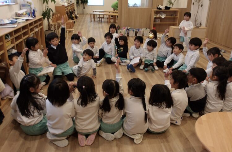 「今日は何月何日でしょう?わかる人?」とまるで保育者のようなたいよう組さんと、きちんと座って話に参加する子どもたち。