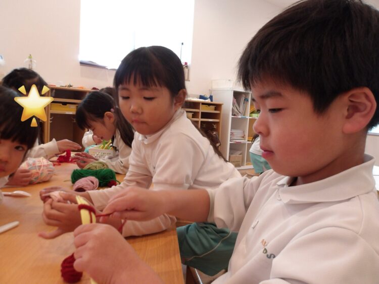 お部屋では毛糸あそびをおこないました。指編みや、ポンポン作りをしましたよ。