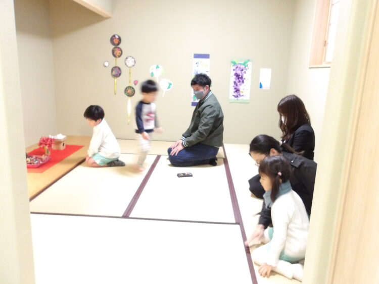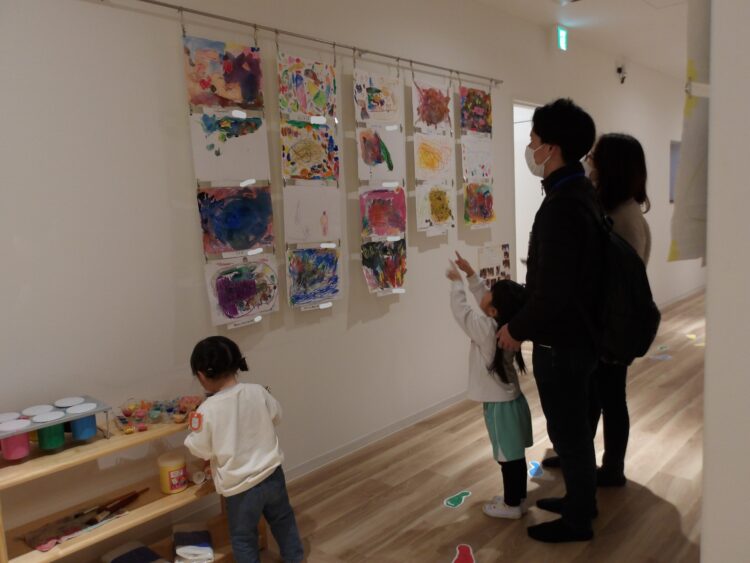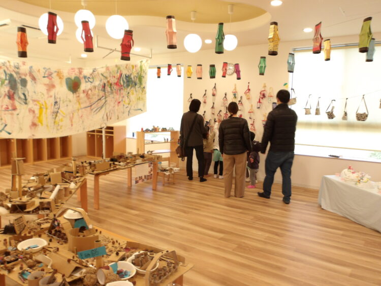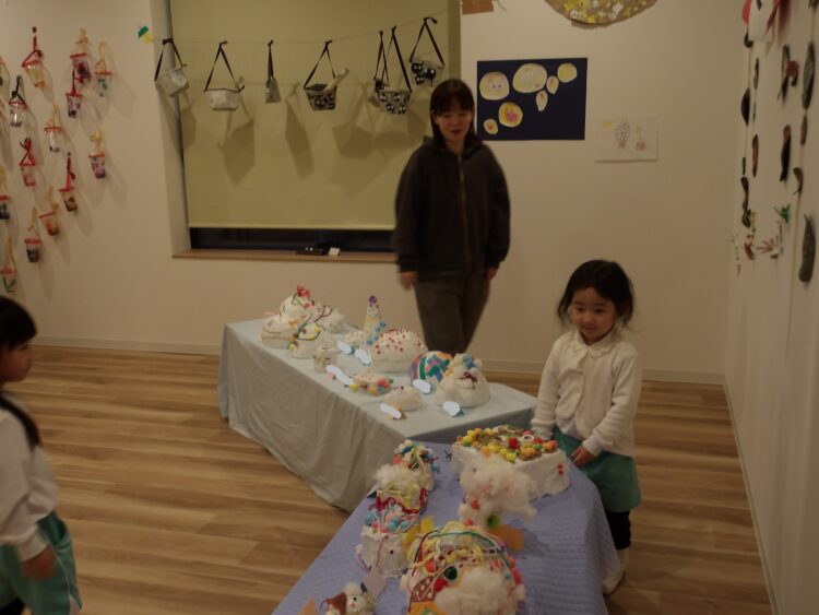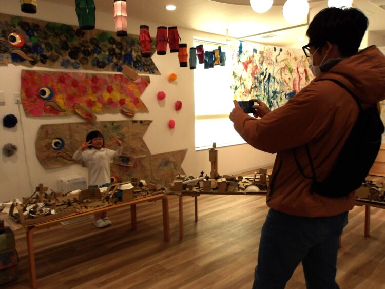 お家の方を案内する前にまずは自分たちが展示を見てまわりました。「どんぐりぼうし可愛いね!」「こいのぼりだー!懐かしい!」と友だちの作品を見て回ったり、今まで作った作品を振り返ったりしていましたよ。