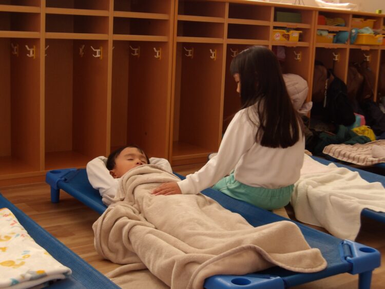 「上靴脱いで寝よう」と優しくタオルケットをかけてくれる姿にほっこりとしました☺️