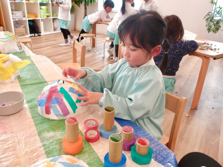 ぼうしやさんを開くそら組さんは、スパンコールやコーンクッションなどの新たに増えた素材を使って帽子作りの続きをしましたよ。