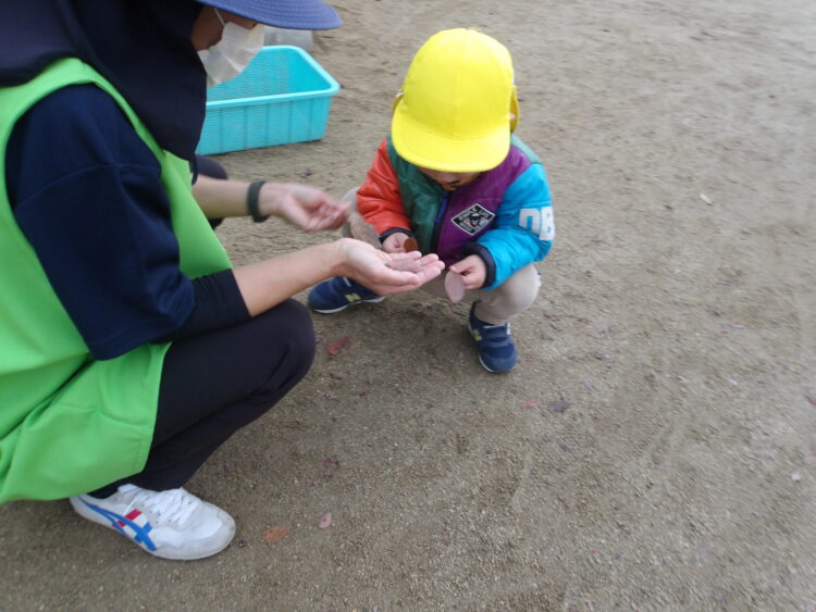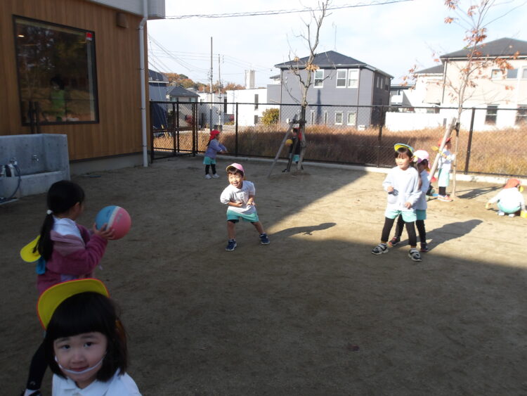 速くボールを投げたり、当たらないように素早く避ける姿が見られました✨ 落ちているどんぐりや葉っぱを拾って先生と観察中でした👀 明日も元気いっぱい遊ぼうね🥰
