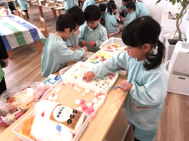 綿は使いたい分だけちぎること、毛糸はどんなふうに使いたいのか、どのくらいの長さが欲しいのかを保育者に伝えるように制作の前に伝えていたのですが、