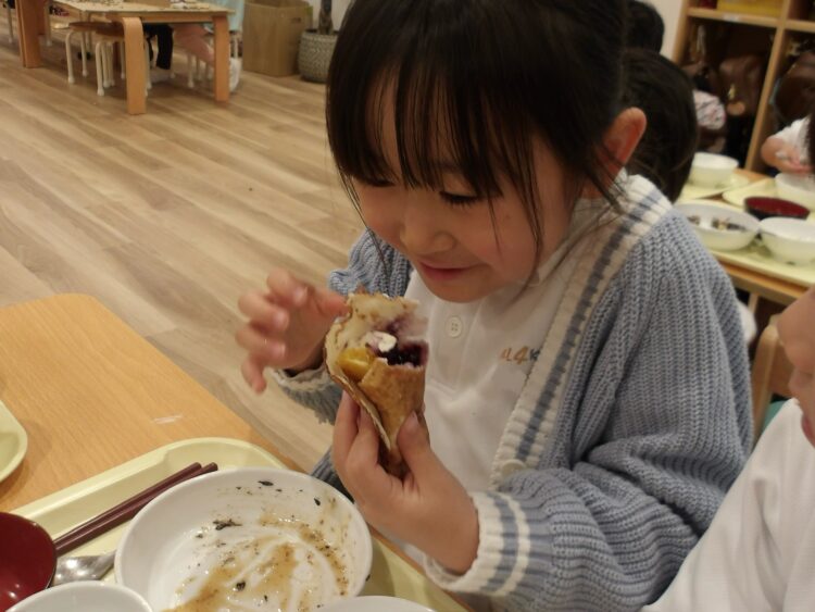 生地が焼き上がるといよいよクレープ作り開始!フルーツやクリームを思い思いに乗せていきます。