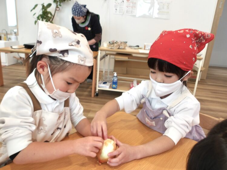 「たまねぎってどこまで剥いていいんだっけ?」と過去のクッキングを思い出したり、保育者に確認したりしながら剥いていました。