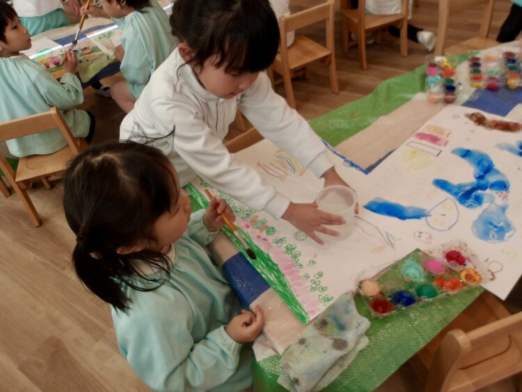 体操の合間にはまた絵を描きました。お友だちが汚れた水を自主的に交換してくれていましたよ。