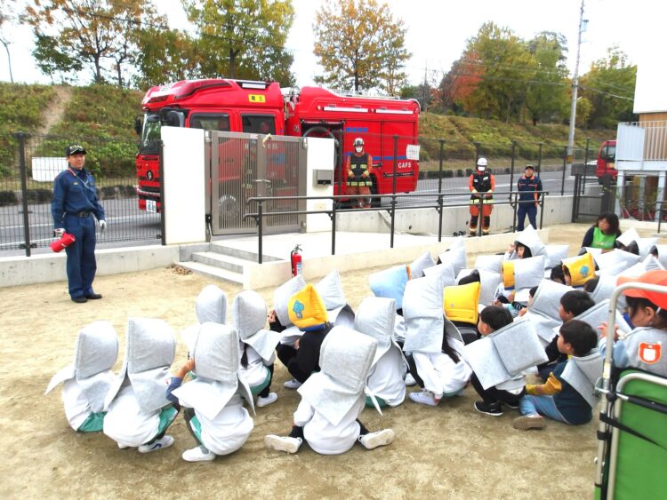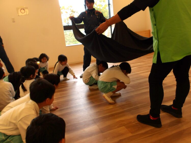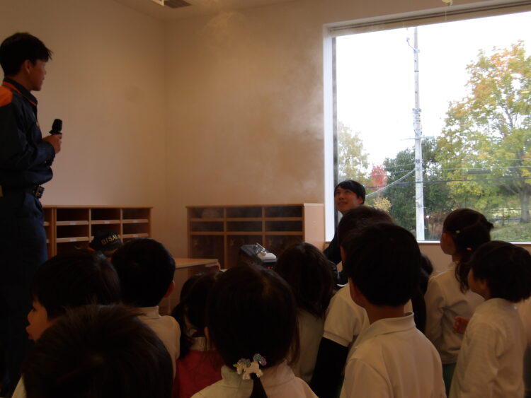 黒い煙には毒があるので、吸わないように屈んで避難することを教えてもらい、練習しました。