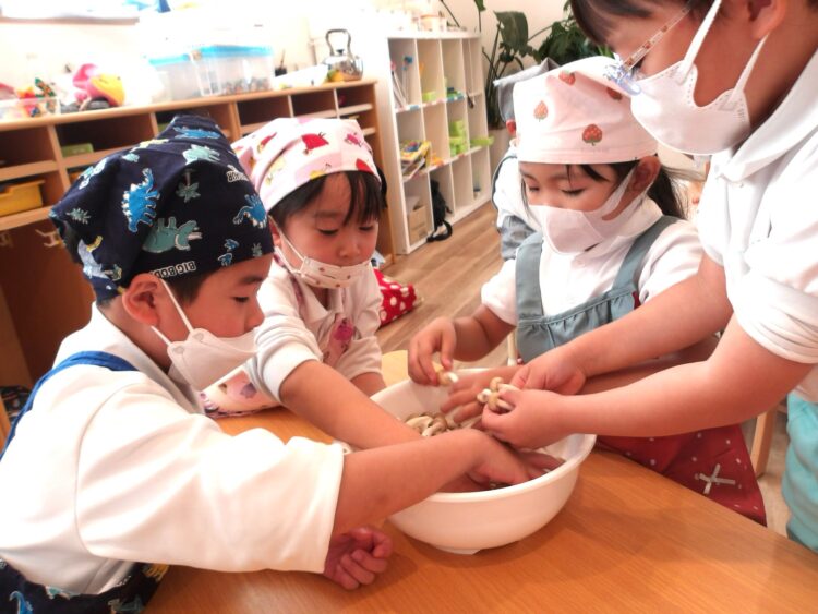 《さつまいも》《しめじ・とうふ》《たまねぎ》チームに分かれて、野菜の下ごしらえをしましたよ。