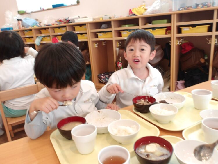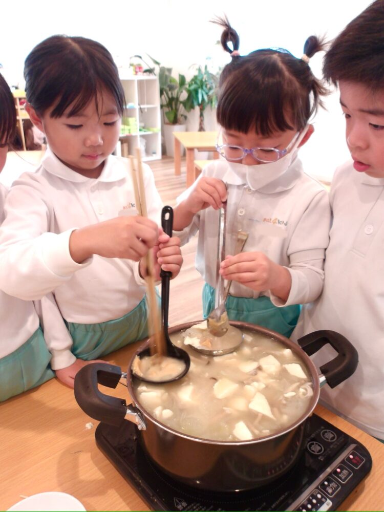 今日はにじ・たいよう組がクッキングを行い、味噌汁を作りました。