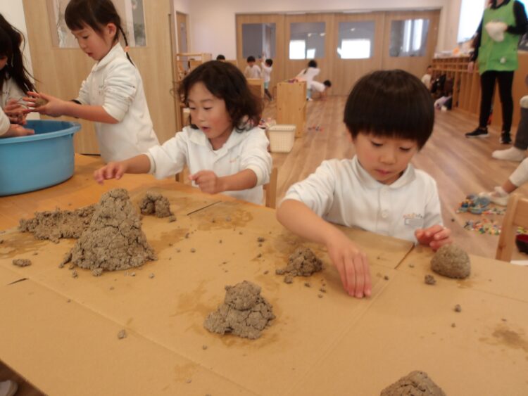 「早く乾いてほしいなあ〜」と呟いたり、みんなの作品を乾かしているシートを囲い、「これ私が作ったやつだよ〜」「◯◯ちゃんのはどれ?」と話し合ったりしていました。