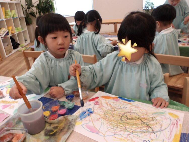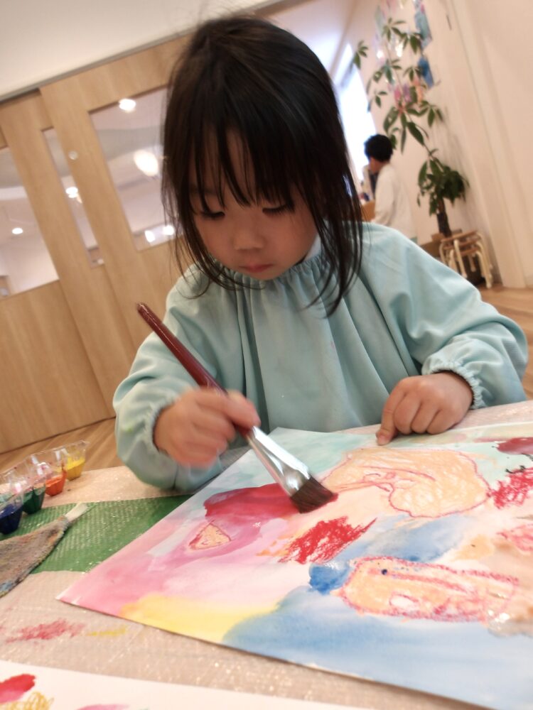 筆に水をつけすぎないことや新しい色を使うときは筆を一回すすぐことなど、いくつかの約束や使い方を知らせると、「わかったー!」と早速楽しそうに色塗りをしていました。