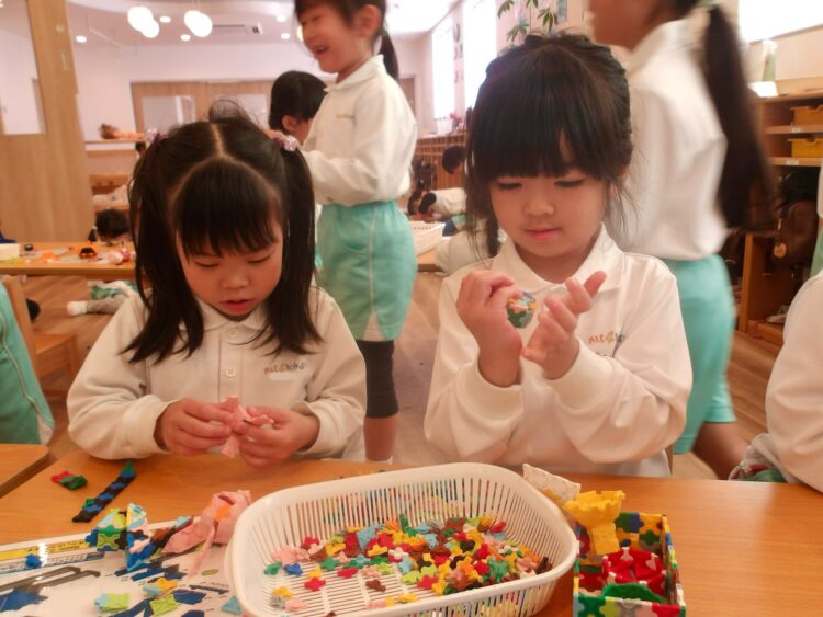 にじ組は昨年度よりも大きな紙を目の前にしてもすぐに描きたいものが思い浮かび、クレヨンをどんどんと滑らせている姿が見られて、成長を感じられました。