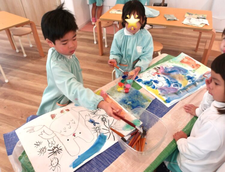 パレットにない色は自分で混ぜて作ろうとしたり、紙の上で滲みながら混ざり合っていく色の変化を楽しんでいましたよ。